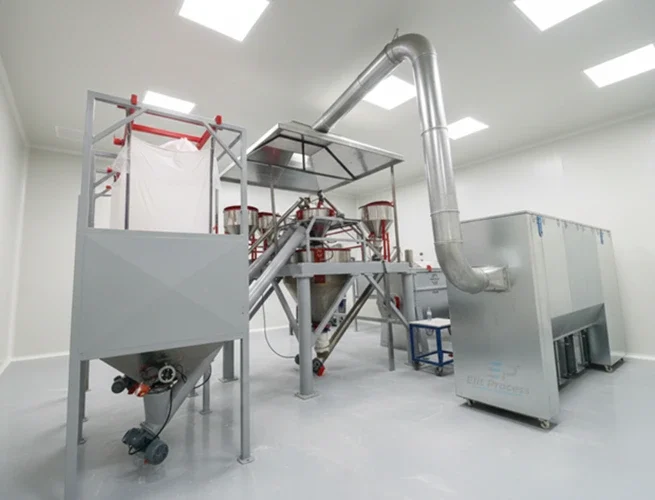 Der BigBag-Sack wird an den Rahmen der Entleerungsstation gehängt. Die Säcke werden normalerweise mit einem Kran oder Gabelstapler in die Station gestellt. Während des Entladens werden die Materialien in den Säcken durch die Schwerkraft oder mechanische Vibrationen entladen. Staubkontrollsysteme verhindern, dass sich während dieses Vorgangs Staub in der Umgebung ausbreitet. Nach Beendigung des Entladevorgangs wird die Station gereinigt. Die Big-Bag-Entladesysteme von EP sind so konzipiert, dass sie für eine einfache Reinigung und Wartung zugänglich sind.