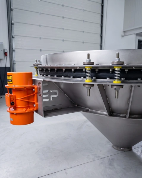 Ein mit dem Vibrationsaustragsboden gelieferter Flansch wird an den Siloauslaufkonus geschweißt oder geschraubt. Spezielle Aufhängungen und eine technische Polymerdichtung sorgen für eine flexible Verbindung zwischen dem Silo und dem Vibrationsaustragsboden. Das Gerät ist mit einem Motor ausgestattet, der bei jeder Materialzufuhr aus dem Silo vibriert.