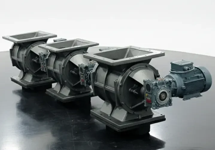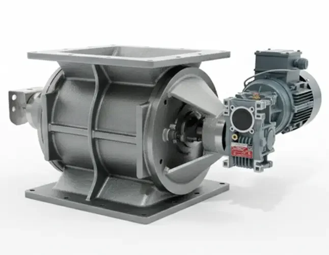Das Grundprinzip von Zellenradschleusen besteht in der kontrollierten Förderung von Material durch eine rotierende Sterntrommel. Beim Durchlaufen der sternförmigen Kanäle der Trommel wird ein gleichmäßiger Materialfluss gewährleistet. Die Trommel dreht sich in regelmäßigen Abständen und das Material wird gleichmäßig verteilt. Auf diese Weise halten Zellenradschleusen den Materialfluss unter Kontrolle und sorgen für eine schnelle und präzise Dosierung der gewünschten Materialmengen. Zellenradschleusen sind ein wichtiger Bestandteil pneumatischer Fördersysteme. Zellenradschleusen regeln den Durchfluss verschiedener körniger oder pulverförmiger Materialien aus Silos, Trichtern, Zyklonen, Filtern, Mischern usw. Schleusen werden eingesetzt, um den Luftstrom zwischen den Ein- und Austragsbereichen des Materials unter dem Einfluss von Druck, Vakuum oder Schwerkraft zu verhindern.