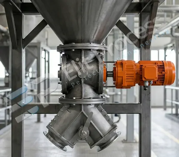 Die Zweiwege-Klappweichen hat eine bewegliche Klappe (Prallplatte). Die Winkelbewegung dieser beweglichen Platte sorgt dafür, dass das Material in die gewünschte Auslaufrichtung geleitet wird. Klappweichen sorgen dafür, dass die mit ihrem Eigengewicht geschütteten pulver- und granulatförmigen Rohstoffe in die gewünschte Position gelenkt werden. Es gibt drei Antriebsmechanismen: manuell, pneumatisch und elektrisch.